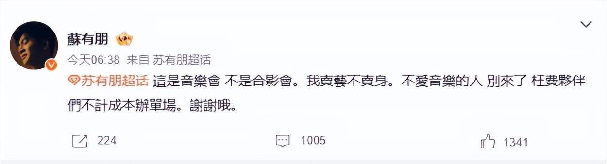 对此,苏有一又发文:“这是音乐会,不是合影会。我卖艺不卖身。不爱音乐的东谈主别来了,枉然伙伴们不计老本办单场。谢谢哦。”